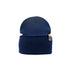 A green knit Organic Beanie from Goggleface with a folded cuff is shown. The beanie features a small rectangular fabric tag on the cuff with minimalistic branding. The texture of the knit is visible, giving it a cozy, warm appearance, making it a timeless accessory in sustainable fashion.